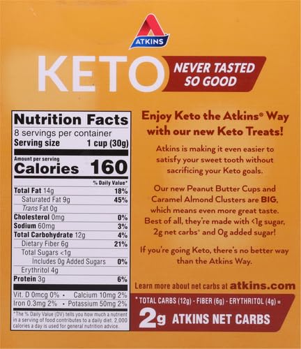 Product descriptionThe perfect treats for anytime snacking – Atkins® Peanut Butter Cups and Atkins Caramel Almond Clusters are perfect treats that won’t sideline your nutritional goals.* Stick with your low carb lifestyle without sacrificing on taste.