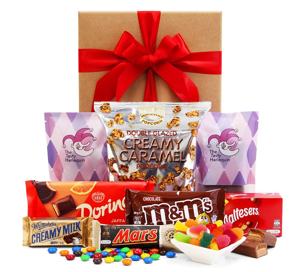 - The gift basket includes: Malteser’s King Share 60g, Mars Bar 47g, Twix Bar 50g, Milky Bar Biscoff 44g, Honeycomb 85g, Party Mix lollies 120g, Whittakers Creamy Milk Chocolate 50g, Double glazed creamy caramel popcorn 100g, Gift box: presented in a small craft chocolate gift box with hand-tied ribbon and gift card.