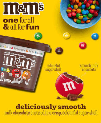 Call off the search! Because those deliciously fun chocolate snacks you’ve been looking for are right here in this pack of M&M’S Milk Chocolate legends! Since 1941, these colourful pieces of creamy milk chocolate coated with a thin crisp shell have delighted chocolate lovers across the globe. M&M’S Bite Size Chocolates are ideal as an on-the-go treat, in the workplace or as a chocolate snack for movie nights. M&M’S make boring meetings go faster, too! They will rocket YOU into fave person territory when you share them as chocolate treats and sprinkle their happy M&M’S Chocolate colours into baking recipes, popcorn TV snacks and over ice cream. Movies at your place? It starts with M&M’S Chocolates!