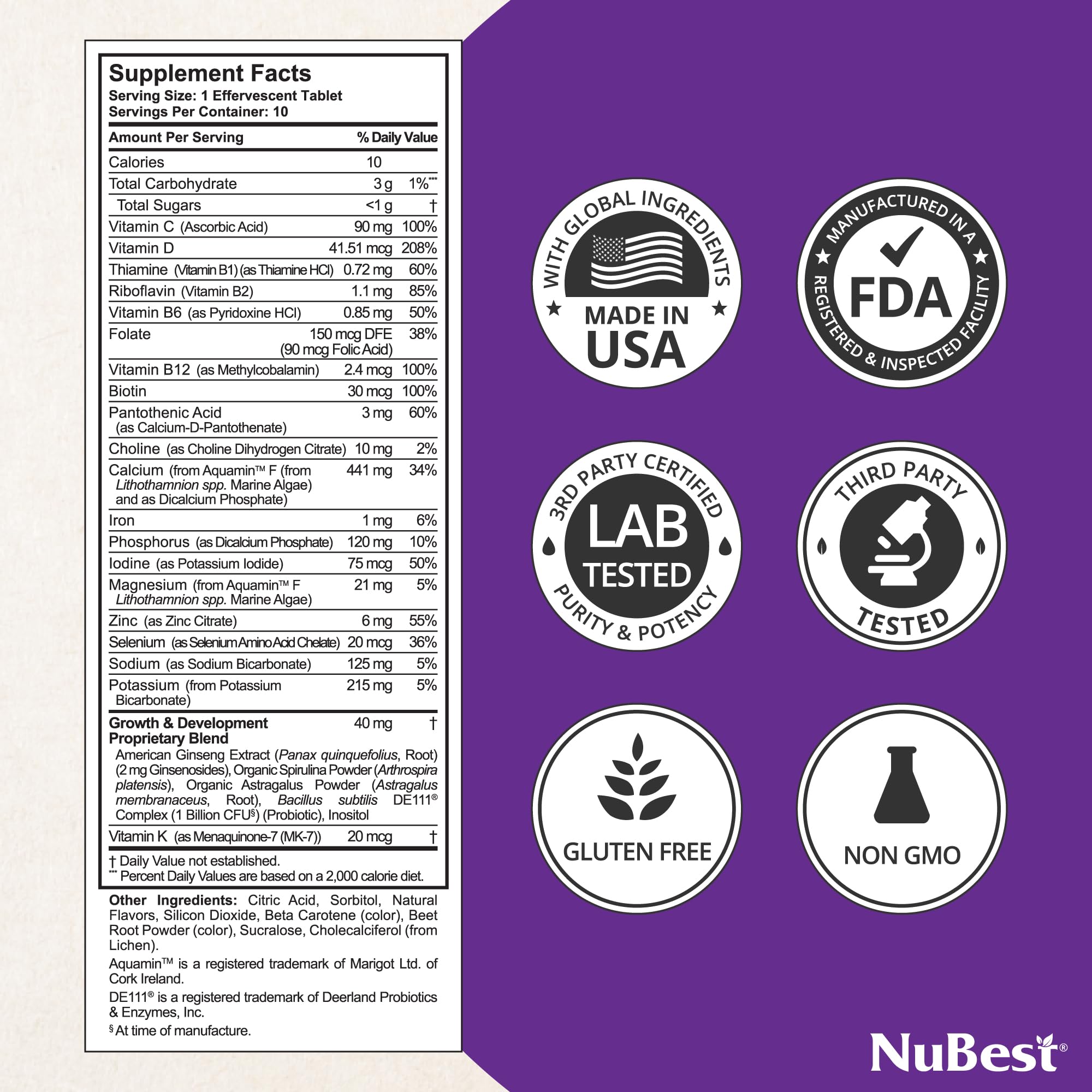 - STRONG BONES, HAPPY KIDS: NuBest Tall Fizzy offers a tasty, bone-strengthening boost for kids and teens with Calcium from red algae, Magnesium, Vitamin K2, and D3. Developed by U.S. Nutritionists and made in an FDA-registered, GMP-certified facility, these natural orange tablets contain under 1g of sugar and are free from GMOs, gluten, soy, grain, and wheat. They support bone strength, digestion, and immunity, making them a top choice for parents seeking quality supplements for growing children.