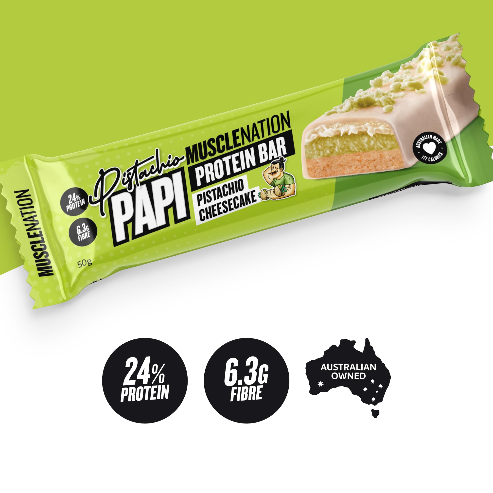 7 reviews for Muscle Nation Cheesecake Pistachio Papi Protein Bar Full of Flavour, Layers, and Inclusions, Soft and Chewy Texture, Convenient Protein Hit – 12 x 50g