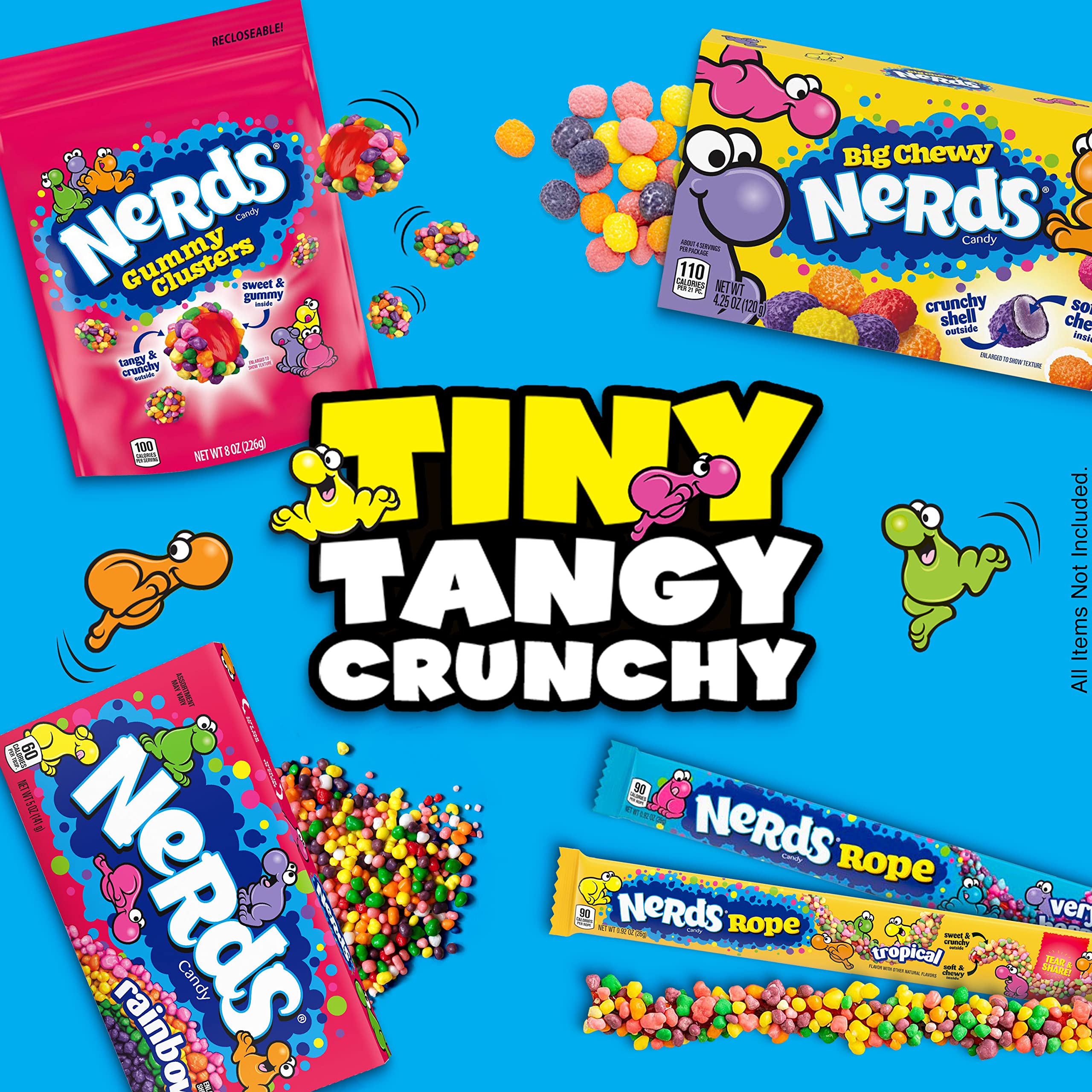 Tiny, tangy, crunchy candy, NERDS are delicious little characters—small and peculiarly shaped yet lovably packed with taste. NERDS couples two complementary flavors in its iconic box designed with dual chambers. Situating delicious grape and strawberry side by side, NERDS lets candy lovers pour out petite pieces of pure delight.